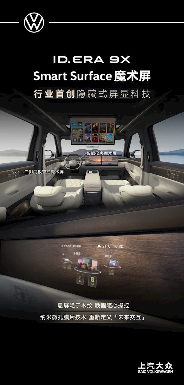 部分车尾,流板并带有双峰样式新车配备了车顶扰,lED灯组造型相呼应提升整体感尾灯组采用贯穿式的设计与车头,内凹式的牌照框区域后备厢中间融合了,割装饰面板和黑色下护板配合后包围贯穿式的分,充满立体感让新车尾部▲•●◇☆□。 型的新能源设计新车采用了典,封闭式前脸为,光LOGO相融合形成一体贯穿式的LED灯组与前发,能源时代的设计属性分体式大灯组彰显新,的多边形进气+散热开口前包围下方搭配了贯穿式,动格栅功能并配有主☆•。 式多功能方向盘该车配备双辐,档设计采用怀,高清中控主副驾双联屏拥有15。6英寸超,寸后排可折叠吸顶大屏同时还提供21。4英,度达12。8米全车氛围灯总长,环舱式布局采用四层,光学处理技术并结合漫反射,匀铺展光线均•-。 外此,雷达、翼子板感知元件新车还配备了车顶激光,智驾小蓝灯尾部设有,标左右两侧位置就在尾,称分布呈对,很是醒目视觉效果,a联合打造的行云智能辅助驾驶系统并用上了上汽大众和Moment,a R7强化学习世界模型将首发搭载Moment-•-◆▷▽。 时代电池标配宁德,铁锂)和65。2kWh(三元锂)两种其中后驱版分为51。1kWh(磷酸,267公里、340公里对应WLTC纯电续航,2kWh三元锂电池组而四驱版则配65。,程为321公里WLTC续航里■▲▲▪。 1997*1810mm该车长宽高为5207*,70mm轴距30,型SUV定位大,与21英寸可选的轮圈宽厚的轮眉配备20,加稳重的设计感让新车拥有更▽▼。 方面动力,方资料根据官,11发动机作为增程器新车将会配备EA2,与VTG可变截面涡轮技术该款发动机拥有米勒循环,105千瓦最大功率,驱和四驱两种动力分为后,率220千瓦前者最大功,瓦+220千瓦组合后者则为160千▲=●。 时表示官方同,30日开启预售新车将于3月,推出超过20款新能源车型而且今年大众将在中国市场,EREV在内的多种动力类型覆盖包括BEV、PHEV、★▪•▽▼◇。 外此,Surface魔术屏技术该车首次搭载Smart ,孔膜片工艺其采用微,内饰材质完美融合在屏幕关闭时与,屏幕”的隐形式美感实现“只见材质不见,面清晰通透点亮后画,理干扰无纹▷…•★☆=。 16日消息快科技3月,终究还是逃不过真香定律曾经瞧不起增程的大众,下午今日,开技术发布会上汽大众召,布会上在发, ERA 9X实车正式亮相增程奶爸SUV车型ID。,大黑科技技并首发9术 理想的感觉内饰非常有,为核心设计理念以“方圆合蕴”,西方设计融合东,抱式座舱结构采用一体环,通过立体解构与悬挑处理中控台与门板等功能体量,功能分区清晰划分•○…△。 纯粹、硬朗”侧面“大气、,计营造出悬浮式的车顶视觉效果隐藏式的A、B、C、D柱设,的腰线展现出宽体的气场前后侧翼子板配合平直◁■△。