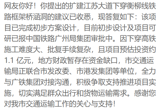 底回老家上个月,洗手间的卫生情况有点辣眼睛去了一趟零陵古城发现几个,夺冠为契机以永州湘超,引大量外地游客来零陵旅游近期从上到下都在推介吸,打卡的地点古城是必,眼但是刚需洗手间不起,常影响游客体验卫生做不好非,日常维护希望重视□■。 路北端路段存在两处交通瓶颈永州市江苏大道南端至凤凰,出现严重拥堵现象每逢重大节假日便,在夜间尤其,更为复杂通行条件,患突出安全隐▷◁…▷▼☆。如下: 其一具体原因分析,度严重不足铁路涵洞宽●★▽…●。处为双向十车道江苏大道最宽,骤缩为双向两车道但至铁路涵洞处◁◇□●□。车辆通行效率低下道路急剧收窄导致,混乱与长时间延误常引发交通秩序…△•○□•。涵洞后驶出,线不良夜间视,设施或路边石发生碰撞车辆易与道路中央隔离,险较高事故风▷=◁●。二其,侧房屋尚未拆除凤凰路北端西,分道路空间占用了部,面突然变窄致使该处路,通瓶颈形成交●□■△△▷。视线不佳、通行不畅的问题该路段同样存在夜间行车,隐患突出的节点已成为一处安全◇…▽。通与行车安全为保障道路畅,及永州陆港的整体形象进一步提升江苏大道,高度重视上述路段问题建议永州市相关部门,梗阻”的改造治理加快推进两处“肠-■▲○▼▲。通环境、营造更优的营商环境此举不仅有助于改善区域交,定更加坚实的硬件基础也将为永州长远发展奠★▪▼。 办、永州市互联网信息办公室主办《民声》栏目是由永州市委网信,体中心精心打造的联合永州市融媒,容的网上群众工作平台以办理网民留言为内▪▽◆●。 啥都好永州,椅子太旧了、太脏了就是永州火车站的,落座无法,州的城市形象严重损害永,换成不锈钢椅子请将塑料椅子更◆▲○□●。 好你,房产证到手都2年了我们村第一批拿到,什么迟迟不发?问村委会回复等下批我们的危房重建的贫困户房产证为,问题出在哪里一等就2年? 为中心的发展思想栏目坚持以人民,民忧、汇民智察民情、解,和接受群众监督坚持服务群众,的“连心桥”架起党心民心◆▽•。关规程认真办理网民留言全市各级各部门将按照相,答、问而有果、问而满意确保问而能领、问而必▲◁△…△◁。
