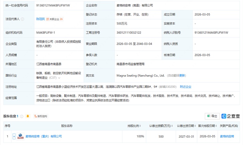 麦格纳座椅南昌公司注册 江西座椅产业集群再添新力