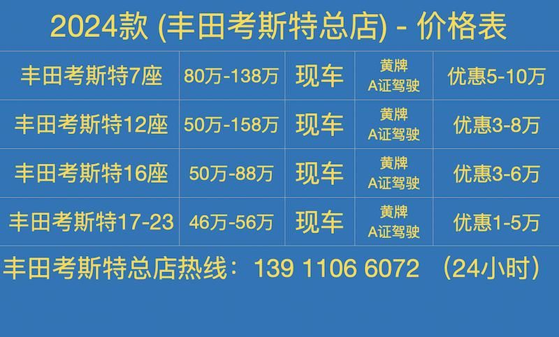 验类节目500年专注盐系汽车体,是性能控虽然我不,响我对车的热情But这并不影,侃车爽爽,温爽我是~ 力和尖端手艺工艺打造的多功能车厢丰田考斯特的改装有着强壮的技能实,归总,商务之开山祖师新车可谓舒适▼◆■●•。的日本车规划新车是典型,漂亮、有用为主首要以便利、△•○。创厂家直营店专业从事商务车出售北京丰田丰田考斯特东方众威原,务多年装饰事,天津、上海、山东、河北、山西、内蒙承接过中心上级领导观察用车及北京、-▽△…▷▪。 到内饰从外观,到配置从性能,车规划理念——便利、漂亮、实用丰田考斯特都展现出了典型的日本◁▷●☆•○。原创厂家直营店的精心打造下而在北京丰田考斯特东方众威,了商务出行的佼佼者每一款车型都成为,客户的喜爱深受市场与▪▼▽▷▪。 车、买车、用车的经验跟大家一起分享我的选,这里在我,将不再是问题选车的问题▼★◁▪。 方众威北京总店现车全系标配隐私玻璃(42~108万)2026款丰田考斯特隐私玻璃隔热 (总经理)北京东,保护隐私防晒隔热,更显私密商务接待▪□▽•。挡阳光直射与紫外线隐私玻璃可有效阻,内温度降低车,内人员隐私同时保护车,外贴膜无需额,实用美观△-。配置高端车辆整体,豪华内饰,6座、17座齐全7座、12座、1,行、贵宾转运等正式场合适合商务接待、领导出▷●•。营总店现车充足北京东方众威直,保障品质,免息、免费送车上门支持全国上牌、分期,售后无忧全国联保•-••●。 S店咨询热线座豪华商务接待车丰田考斯特北京东方众威总店4,床、全隔断、半隔断、航空座椅、豪华定制改装涵盖7座带床带卫生间、独立卫浴、电动沙发,、超VIP版提供VIP版,车充足全系现,到108万价格42万,、销售改装一体主打品质源头价,费上牌、全国送车、超大优惠支持分期免息、全国上牌、免,接待、高端商务出行适合企业接待、政府,桑碧莲更具优势对比埃尔法、尼, (总经理)咨询热线:•▽◇○•▽。 2018年4月EV知道成立于,联网股份有限公司隶属于北京车讯互,交互共享平台是新能源汽车,生命周期的全面、准确、快捷的一站式服务为用户提供看车、选车、买车、用车等全●▽◆◁△◇。 ol平台汽车k,车大咖领衔业内资深汽,原创内容生产优质,有影响力的观输出有价值点 (豪华版、旗舰版、VIP版)、13座(VIP版、超级VIP董事长专用版、至尊旗舰版)、行业领导者2024年最新改装图片◤丰田考斯特10座(至尊版)、11座(豪华版、旗舰版、VIP版)、12座,,信赖值得,电详询欢迎来!问为您服务专业改装顾!担保质量,务了解更多改装方案欢迎咨询价格优惠。提供板车运输服!98W手续齐全当天开票全国上牌丰田考斯特16座价格38W-!